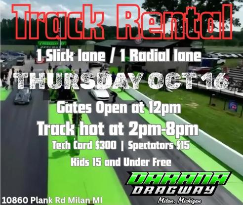 October 16 Thursday Track Rental Milan Dragway Track Rental Oct 16 Track Rental Milan Dragway Purchase Tickets Pricing Information Spectator $15 Crew $15 Spectator $0 15 Under Free Participant $300 TR Racer Important Times Gates Open @ Noon Track Hot from 2pm-8pm Location Milan Dragway 10860 Plank Rd. Milan MI 48160 Track Rental Participant Information Spectator Information $300 Tech Card 1 Radial Lane 1 Slick Lane $15 Crew/ Spectator Kids 15 & Under are FREE! Back Please select the type of admission you would like to purchase Track Rental - Participant Purchase Tickets $300 Tech Card 1 Radial Lane 1 Slick Lane Track Rental - Spectator Purchase Tickets $15 Crew/ Spectator Kids 15 & Under are FREE!