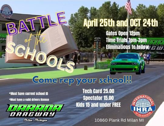 April 25 Saturday Battle of the Schools Milan Dragway Come rep your school!!! *Must have current school ID* *MUST HAVE A VALID DRIVERS LICENSE* Apr 25 Battle of the Schools Milan Dragway Purchase Tickets Pricing Information Spectator $15.00 Crew $15.00 Spectator $0.00 15 Under Free $15.00 Media Participant $25.00 BOTS Bracket 1 $25.00 BOTS Bracket 2 $25.00 BOTS Bike $25.00 BOTS Instructor $25.00 BOTS Team Class Important Times Gates Open @ Noon Time Trials 1pm-3pm Eliminations to Follow Location Milan Dragway 10860 Plank Rd. Milan MI 48160 Come rep your school!!! *Must have current school ID* *MUST HAVE A VALID DRIVERS LICENSE* Participant Information Spectator Information Tech Card $25 Crew/Spectator $15 Kids 15 & Under are FREE!!! Media (Must be on approved list) $15 Back Please select the type of admission you would like to purchase Battle of the Schools - Participant Purchase Tickets Tech Card $25 Battle of the Schools - Spectator Purchase Tickets Crew/Spectator $15 Kids 15 & Under are FREE!!! Media (Must be on approved list) $15