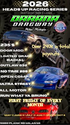 May 01 Friday Heads Up Milan Dragway Welcome Back Racers! May 01 Heads Up Milan Dragway Purchase Tickets Pricing Information Spectator $25.00 Crew $25.00 Spectator $0.00 15 Under Free $30.00 Pit Parking Pass $25.00 Media Participant $150.00 235-8.5 $200.00 All Motor $300.00 Door Mod $300.00 Limited Drag Radial $200.00 NT 28s $150.00 Open Comp $300.00 Outlaw 632 $300.00 Run What Ya Brung $200.00 Ultra Street Important Times DARANA MILAN FRIDAY HEADS UP SCHEDULE: Racer Gates Open: 8:00 AM Qualifying: 10:00 AM Spectator Gate Opens: 10:00 AM Eliminations start after 3 qualifying sessions Location Milan Dragway 10860 Plank Rd. Milan MI 48160 Welcome Back Racers! Participant Information Spectator Information DOOR MOD – Entry Fee: $300 Winner: $5,000 Runner Up: $800 (9-15 cars) Semis: $300 (16 & up cars) ALL MOTOR – Entry Fee: $200 Winner: $3,000 Runner Up: $800 (9-15 cars) Semis: $200 (16 & up cars) LIMITED DRAG RADIAL – Entry Fee: $300 Winner: $5,000 Runner Up: $800 (9-15 cars) Semis: $300 (16 & up cars) OUTLAW 632 – Entry Fee: $300 Winner: $5,000 Runner Up: $800 (9-15 cars) Semis: $300 (16 & up cars) OPEN COMP – Entry Fee: $150 Winner: $2,500 Runner Up: $1000 Semis: $300 Quarters: $150 Entry Fee: $150 Bikes Permitted! RUN WHAT YA BRUNG – Entry Fee: $300 Winner: $3,000 Runner Up: $800 (9-15 cars) Semis: $200 (16 & up cars) ULTRA STREET – Entry Fee: $200 Winner: $2,000 Runner Up: $800 (9-15 cars) Semis: $200 (16 & up cars) Ladder NT 28s – Entry Fee: $200 Winner: $3,000 Runner Up: $800 (9-15 cars) Semis: $200 (16 & up cars) Milan 235-8.5 – Entry Fee: $150 Winner: $1,000 Runner Up: $300 Crew/Spectator $25 Media (MUST BE ON APPROVED LIST) $25 Kids 15 & Under are FREE!!!!! Pit Parking $30 Back Please select the type of admission you would like to purchase Heads Up - Participant Purchase Tickets DOOR MOD – Entry Fee: $300 Winner: $5,000 Runner Up: $800 (9-15 cars) Semis: $300 (16 & up cars) ALL MOTOR – Entry Fee: $200 Winner: $3,000 Runner Up: $800 (9-15 cars) Semis: $200 (16 & up cars) LIMITED DRAG RADIAL – Entry Fee: $300 Winner: $5,000 Runner Up: $800 (9-15 cars) Semis: $300 (16 & up cars) OUTLAW 632 – Entry Fee: $300 Winner: $5,000 Runner Up: $800 (9-15 cars) Semis: $300 (16 & up cars) OPEN COMP – Entry Fee: $150 Winner: $2,500 Runner Up: $1000 Semis: $300 Quarters: $150 Entry Fee: $150 Bikes Permitted! RUN WHAT YA BRUNG – Entry Fee: $300 Winner: $3,000 Runner Up: $800 (9-15 cars) Semis: $200 (16 & up cars) ULTRA STREET – Entry Fee: $200 Winner: $2,000 Runner Up: $800 (9-15 cars) Semis: $200 (16 & up cars) Ladder NT 28s – Entry Fee: $200 Winner: $3,000 Runner Up: $800 (9-15 cars) Semis: $200 (16 & up cars) Milan 235-8.5 – Entry Fee: $150 Winner: $1,000 Runner Up: $300 Heads Up - Spectator Purchase Tickets Crew/Spectator $25 Media (MUST BE ON APPROVED LIST) $25 Kids 15 & Under are FREE!!!!! Pit Parking $30